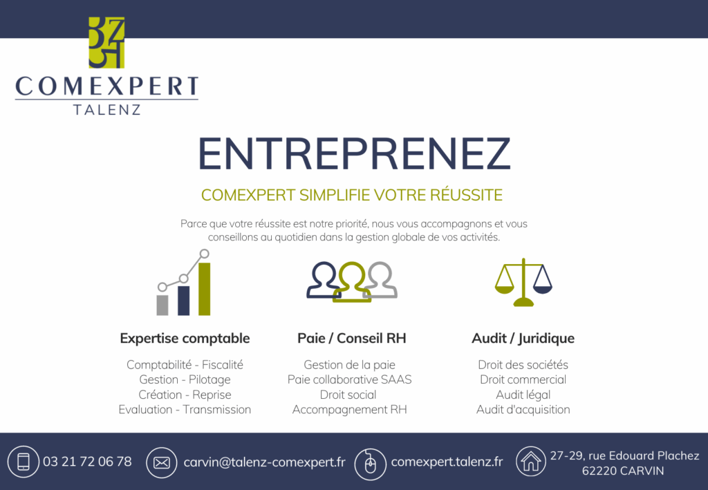 Notre cabinet d’expertise comptable de Carvin assure l’accompagnement des entreprises au cœur du Carembault. Chaque jour, nos collaborateurs s’investissent pleinement pour offrir à nos clients des services de qualité basés sur l’accompagnement, le développement et la proximité, des valeurs chères à notre cabinet et qui fait de nous un accompagnement privilégié dans la réussite de votre projet.